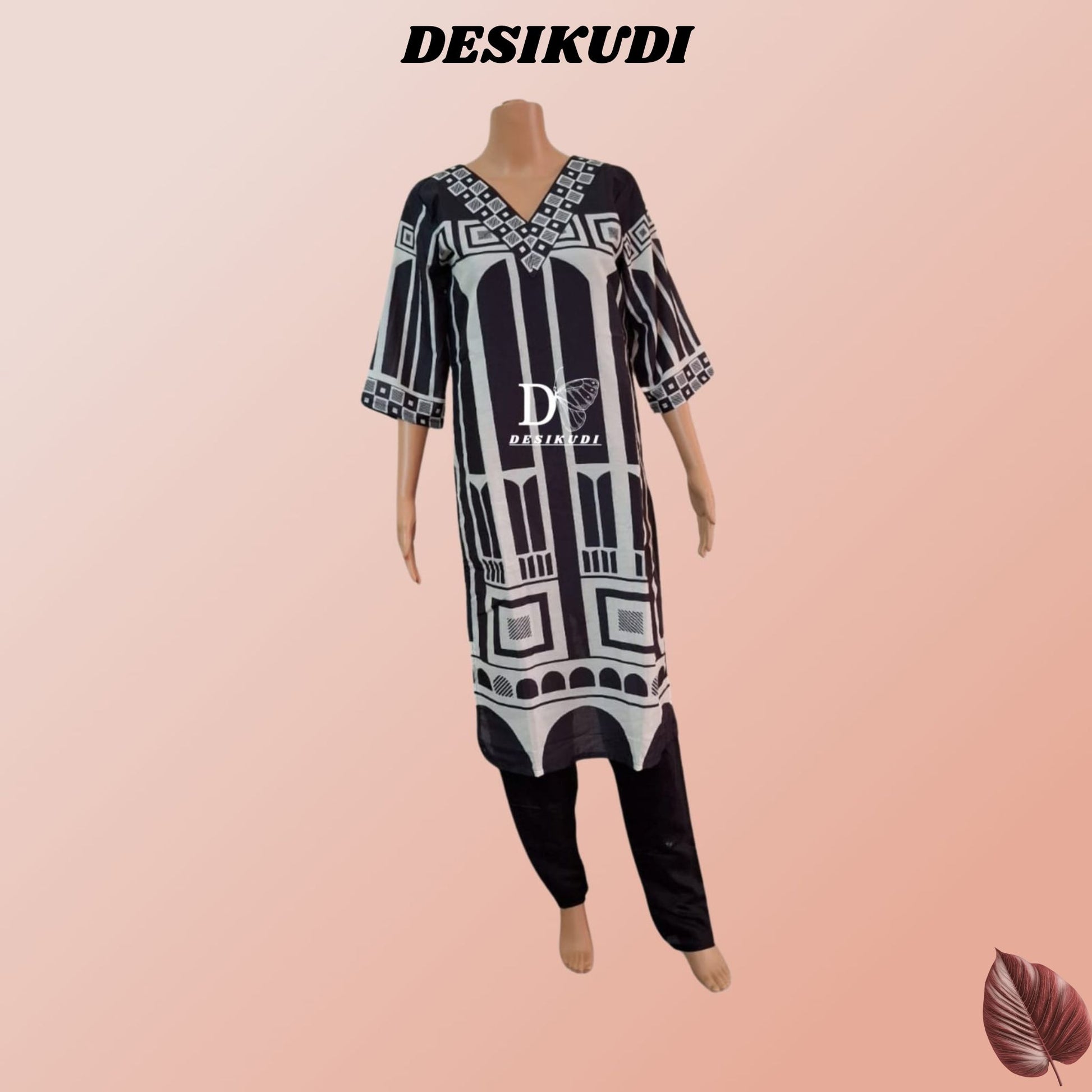 Bold, classy, and effortlessly chic—the Monochrome Black and White Set is designed for the modern woman who loves to make a statement. This black and white geometric printed kurta features a flattering V-neckline with a striking patterned border. The relaxed fit and breathable fabric make it perfect for all-day wear. Paired with solid black straight pants, this set blends traditional charm with contemporary appeal.
