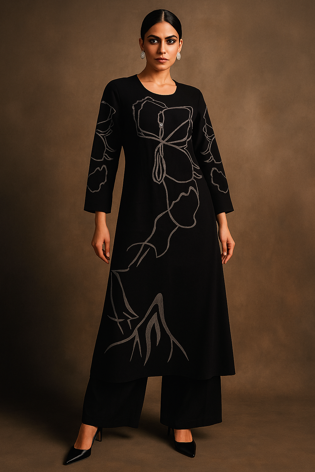 Make a bold statement with the Noir Bloom Palazzo Set, featuring abstract floral embroidery on a deep black base. This set is designed for the modern woman who loves elegance with a contemporary touch. The straight-cut kurta with full sleeves gives it a chic and versatile appeal, perfect for evening gatherings, office wear, or casual brunches. The matching flowy palazzo pants enhance comfort while keeping the look sophisticated and stylish.