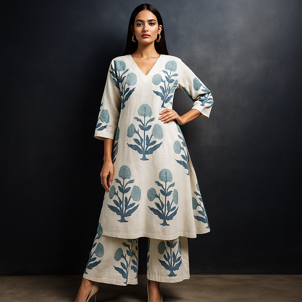 With oversized floral block prints in cool blue tones, Bloom Saga brings a refreshing burst of desi elegance. The flared silhouette and full-length kurta enhance the comfort and movement of this everyday staple.
