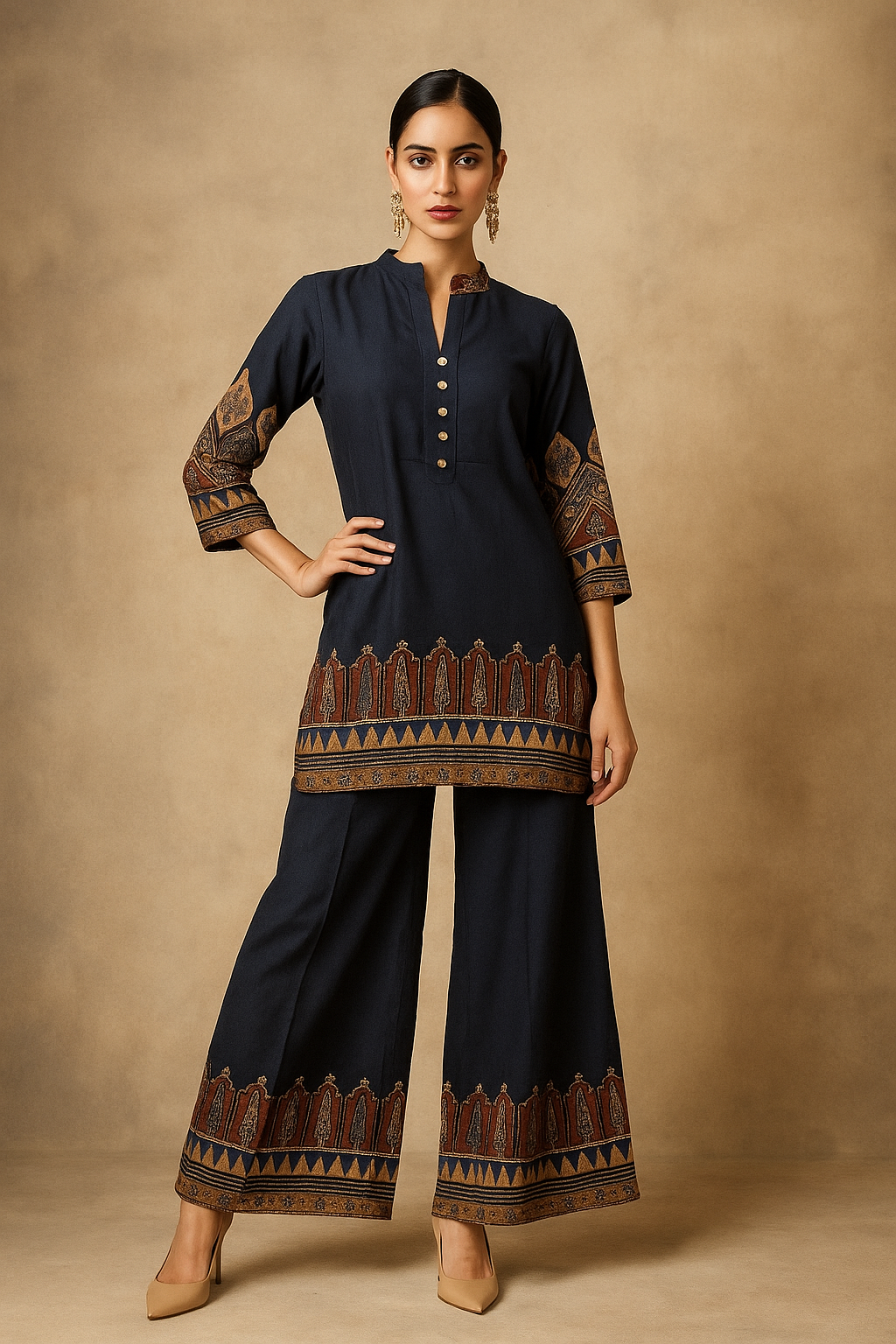 The kurta features a straight-cut silhouette with a mandarin collar and button-down placket, adding a refined yet stylish touch. Paired with printed palazzo pants, this set ensures a chic, coordinated look that is as comfortable as it is fashionable.