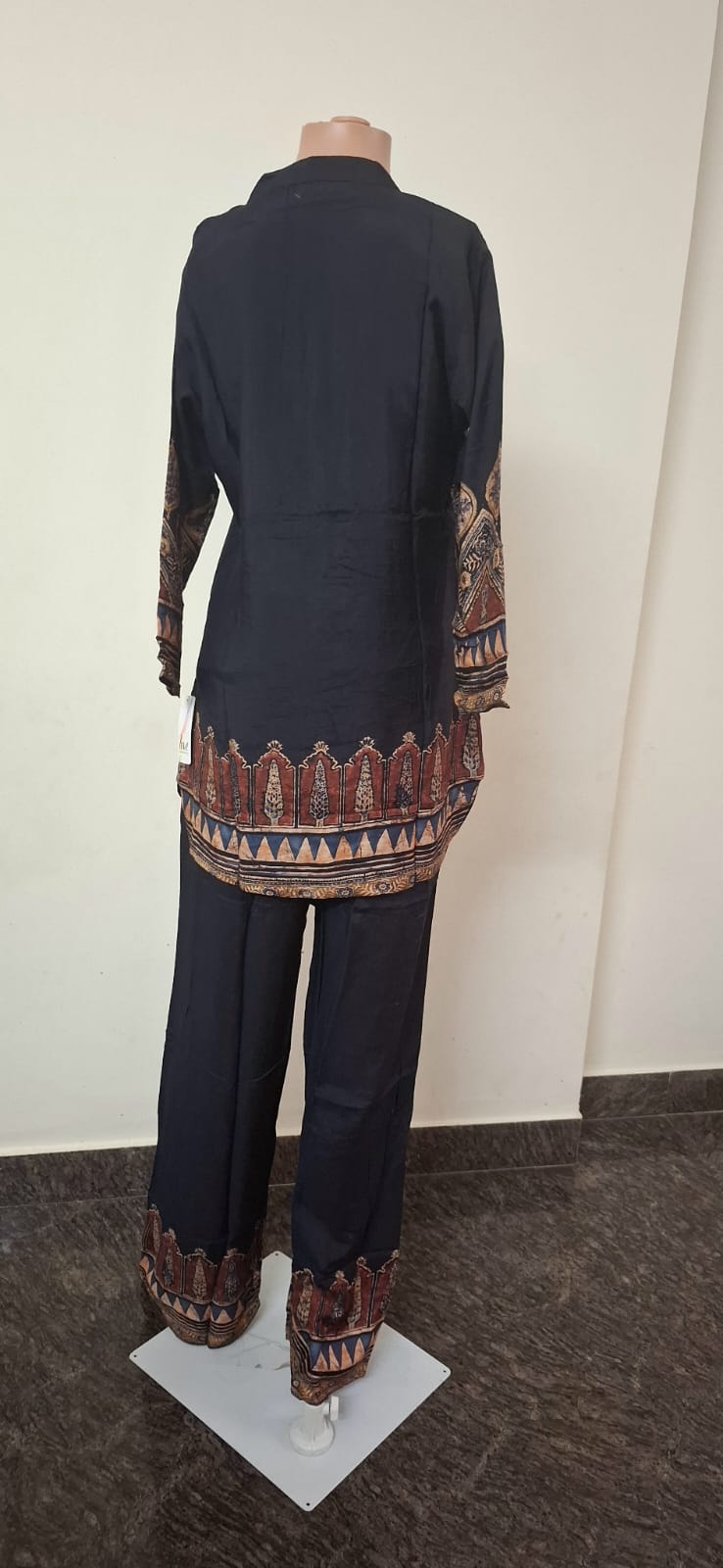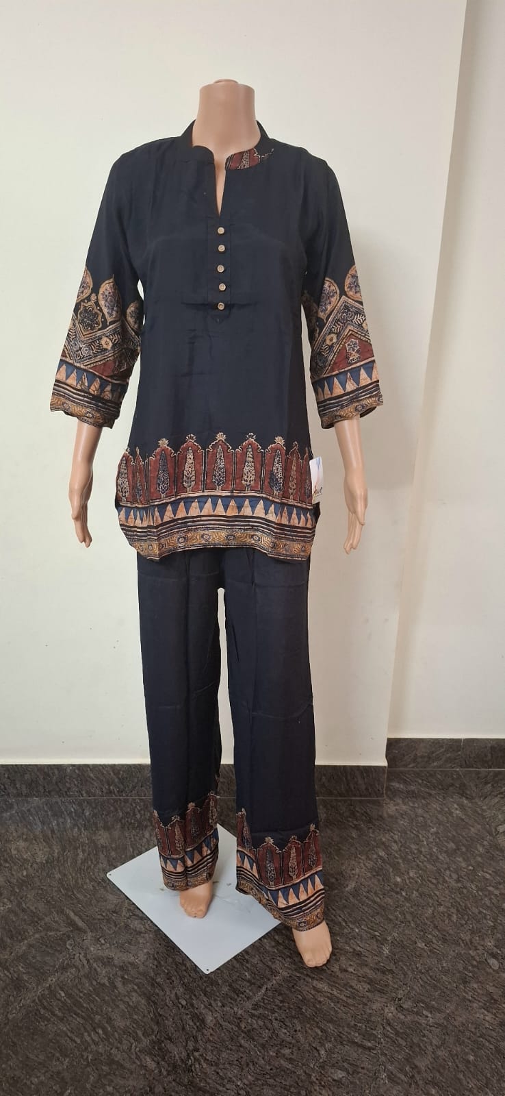 Redefine festive elegance with our COSMIC BLACK Printed Palazzo Set, a stunning blend of contemporary comfort and ethnic charm. Designed in a rich black fabric with intricate ethnic-inspired prints on the kurta hemline, sleeves, and palazzo borders, this outfit is perfect for both casual and festive occasions.