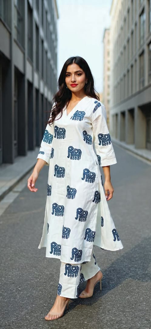 Make a playful yet powerful statement in this white kurta set featuring bold indigo elephant block prints. The relaxed fit and breathable fabric make it perfect for work-from-home days or casual brunches.
