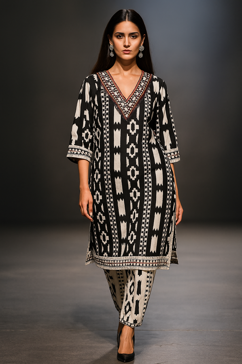 Elevate your ethnic charm with DESI KUDI’s BLACK IKKAT BEAUTY Kurti Palazzo Set, a timeless blend of elegance and comfort. Crafted from premium cotton, this black and white ensemble features an exquisite Ikat-inspired print that adds a touch of sophistication to your festive and casual wardrobes alike.