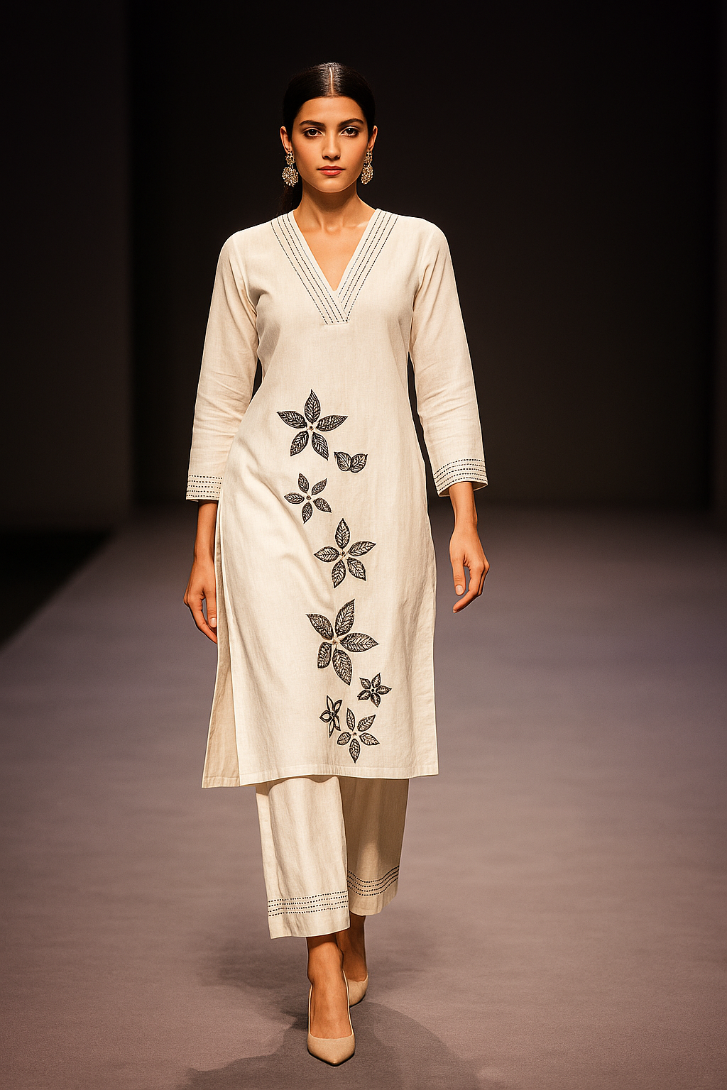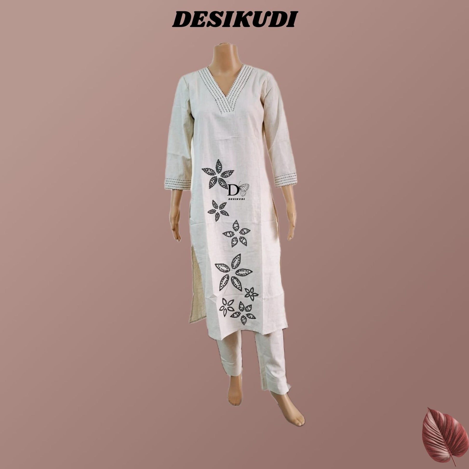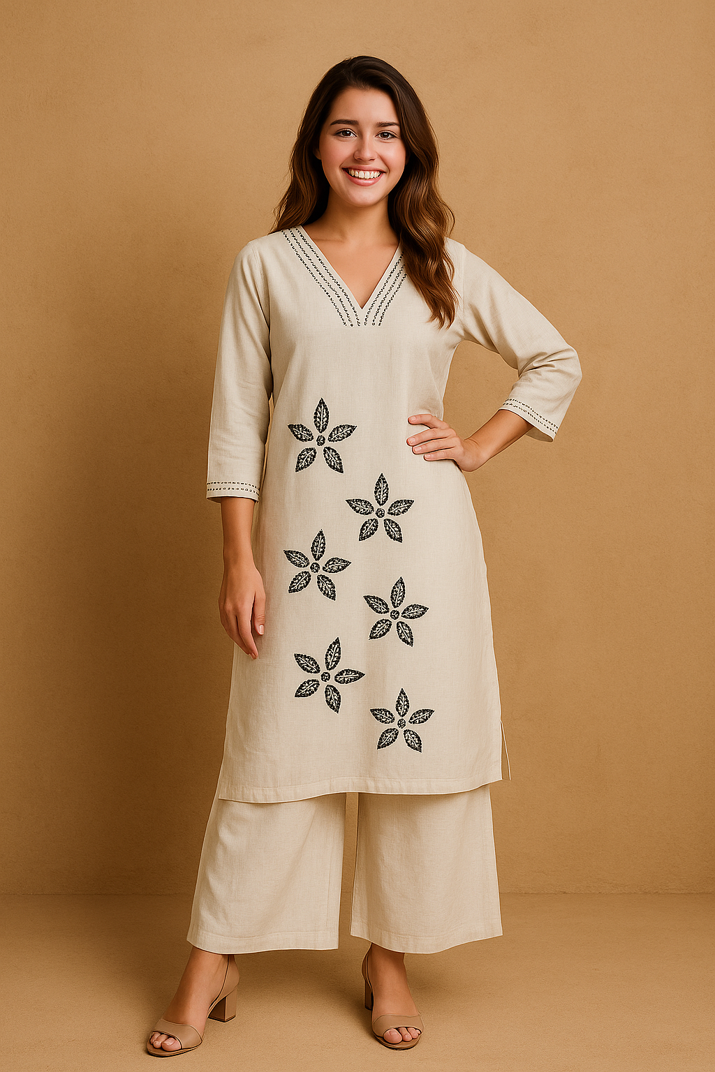 Embrace effortless elegance with this serene white Khadi Kurti set, adorned with delicate black floral embroidery. Its minimalist charm and breathable fabric make it a perfect choice for workwear, casual outings, or summer brunches.