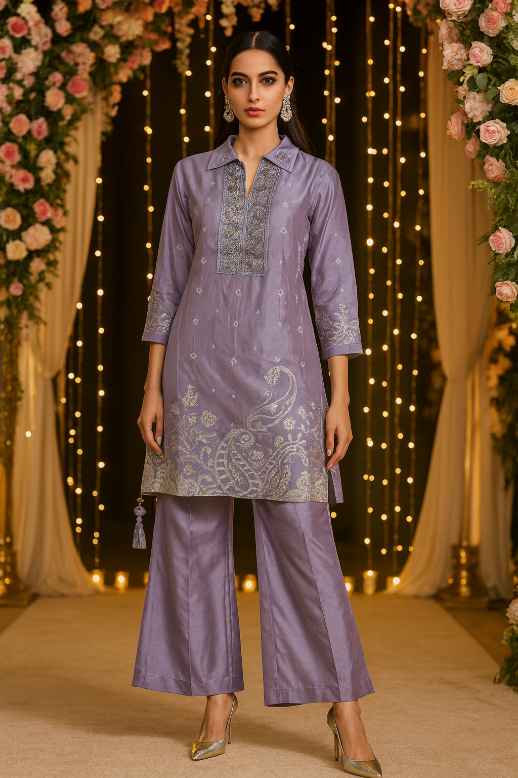Step into elegance with this premium MAUVE CRAPE PLAZZO SET beautifully adorned with intricate zardosi handwork and delicate embroidery. The collared neckline and shimmering embellishments add a regal charm, while the flowy palazzo ensures comfort with style. Perfect for festive gatherings, weddings, or evening celebrations, this outfit blends luxury and tradition seamlessly.
