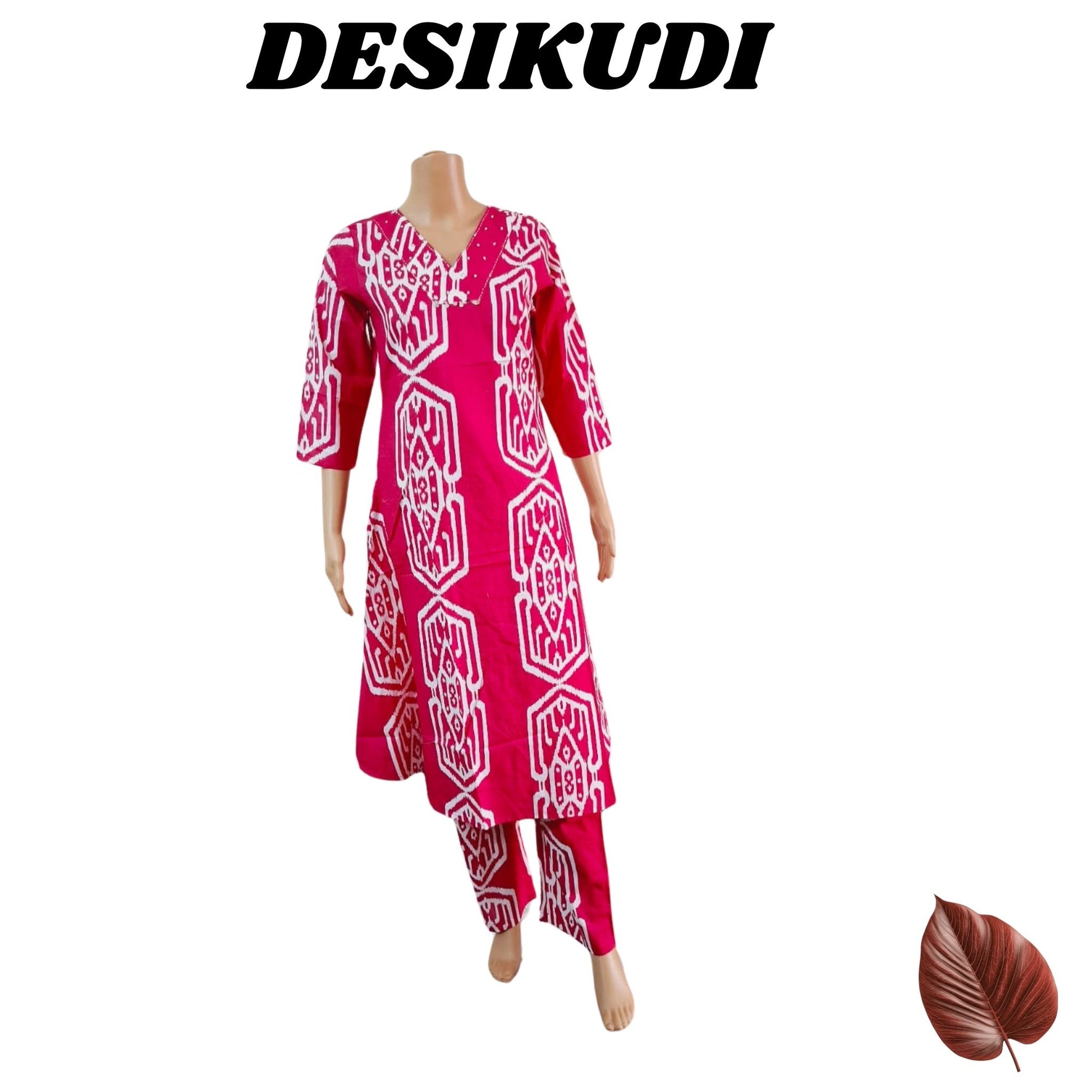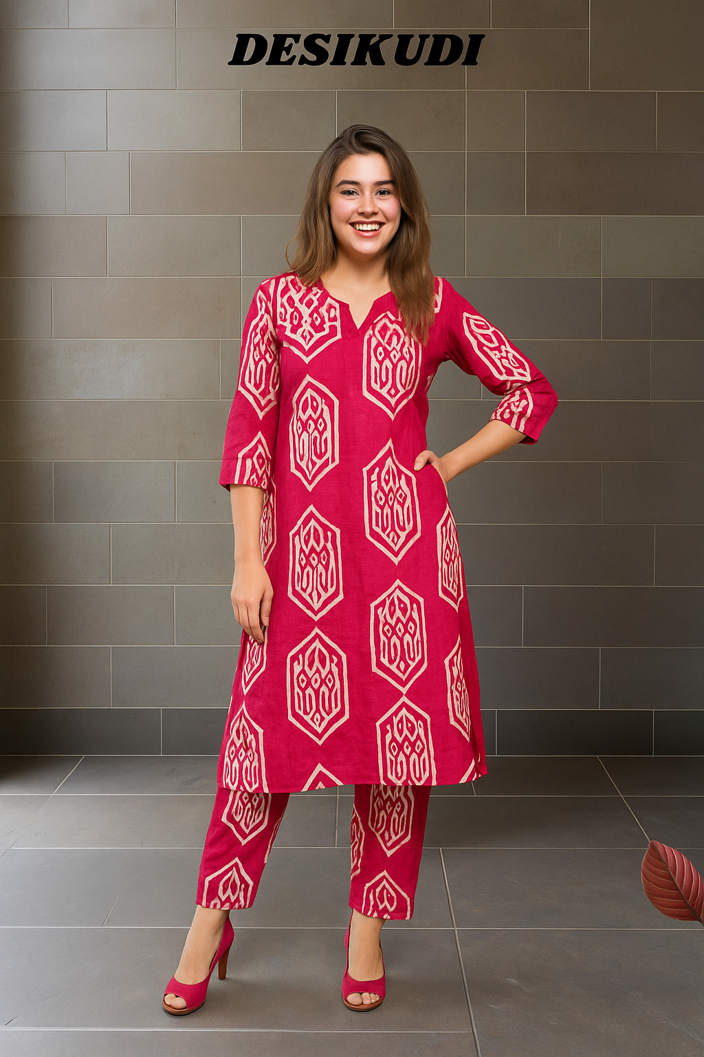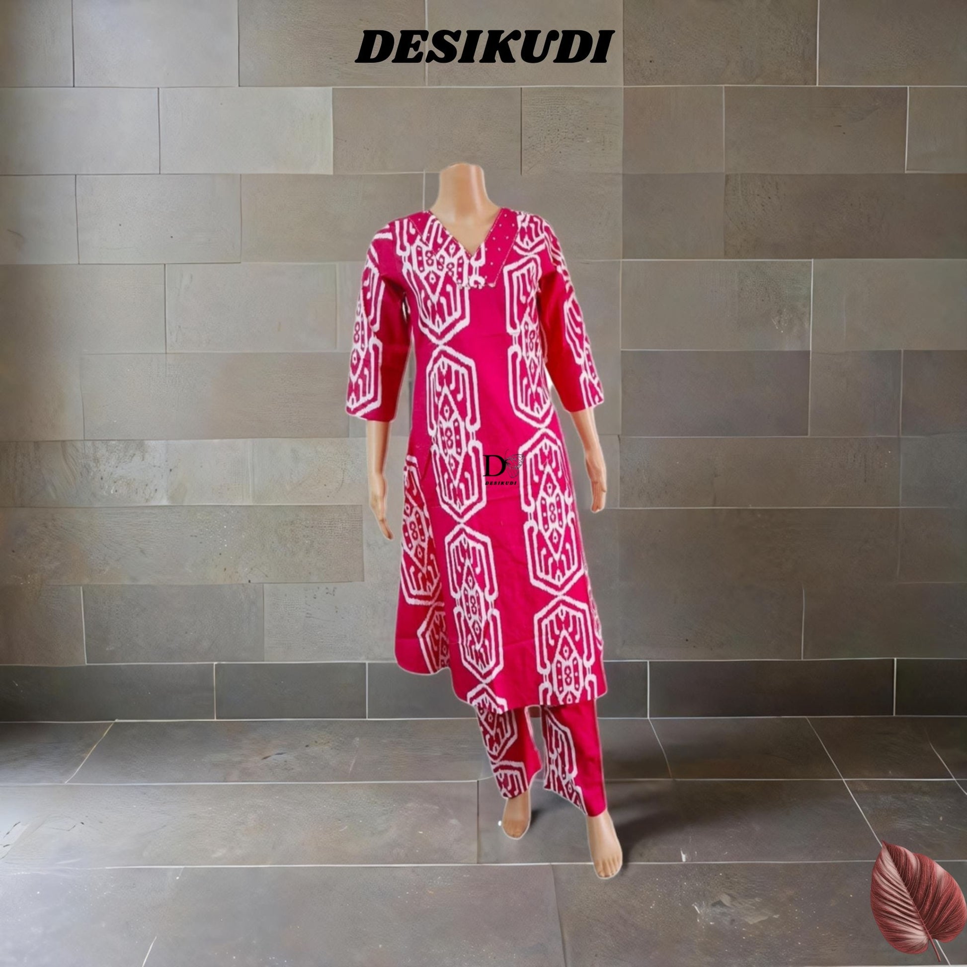 Make a bold statement with the Pink Elegance Kurti Set, featuring a stunning pink and white geometric Ikat print. The three-quarter sleeves and straight-cut pants add a structured, modern appeal, while the embellished V-neckline brings a touch of grace. Designed for both casual and workwear, this set combines vibrance with sophistication, perfect for those who love to stand out.