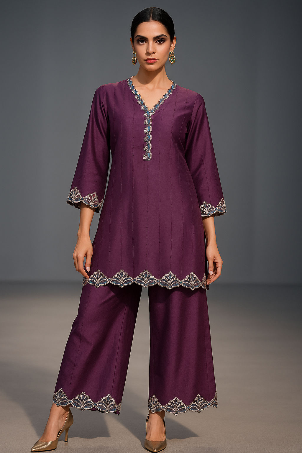 Add a royal touch to your festive style with this ROYAL MAUVE PLAZZO SET. Featuring delicate thread embroidery on the neckline, sleeves, and hemline, this outfit is a perfect blend of charm and elegance. The rich fabric gives it a festive sheen, making it ideal for family functions, parties, or festive occasions.