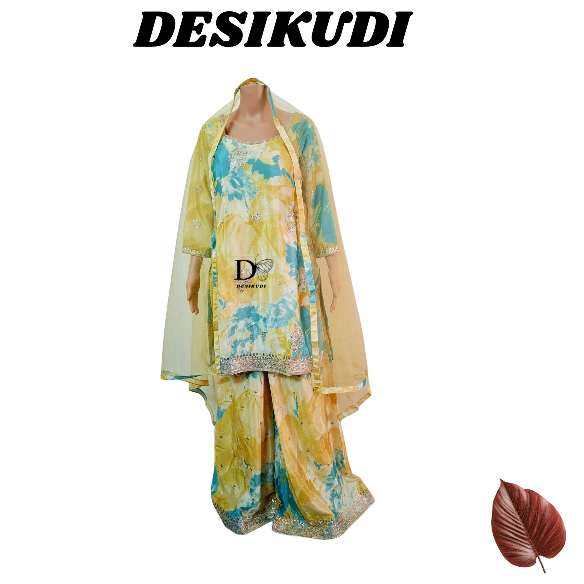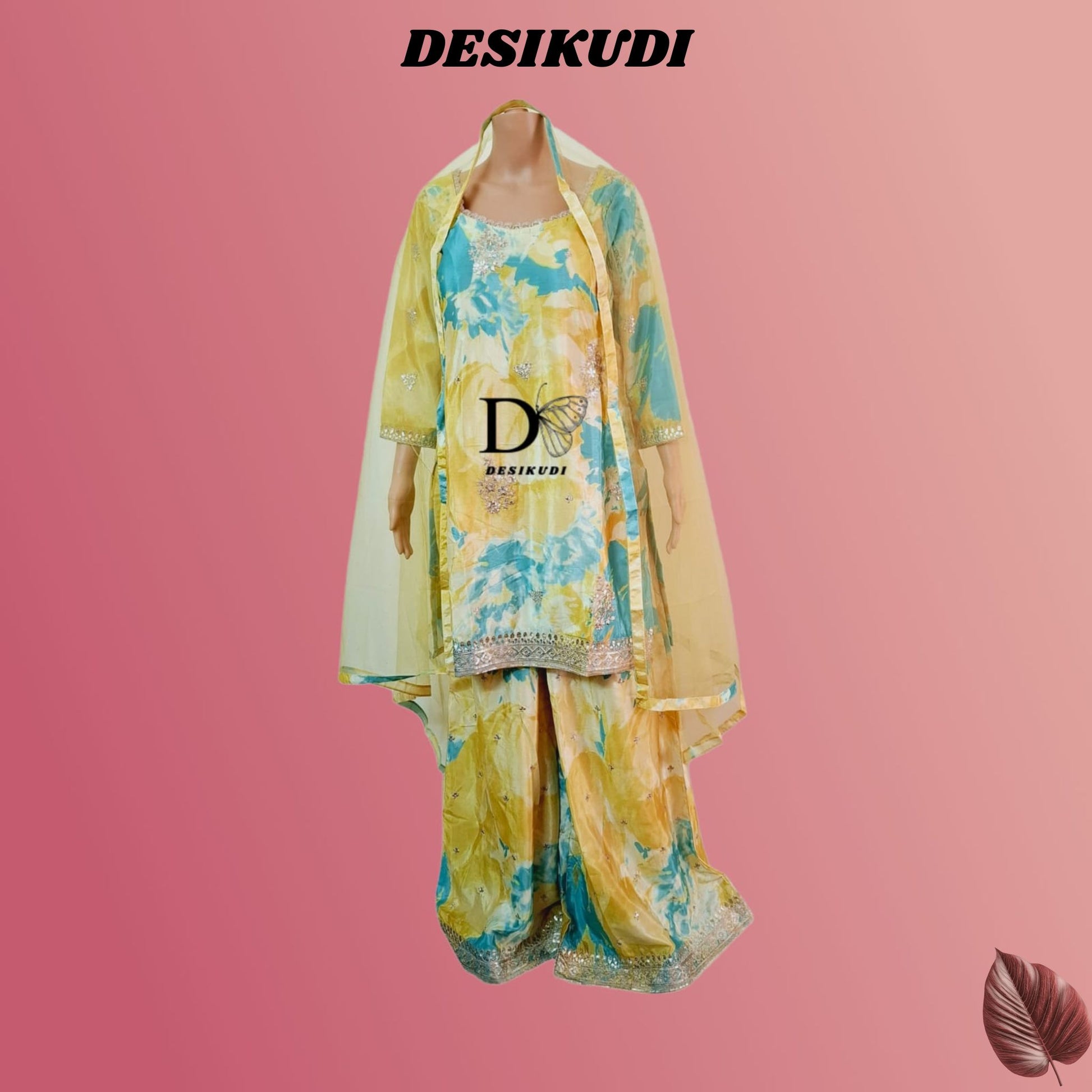 Drenched in warm golden hues and vibrant floral accents, the Lemonade Sharara Set is a radiant celebration of traditional charm and modern elegance. The kurti is adorned with intricate mirror work and delicate embroidery, exuding festive opulence. Paired with a flowy crinkled sharara and a sheer dupatta with shimmering borders, this set is perfect for festive gatherings, haldi ceremonies, or special occasions where you want to shine effortlessly.