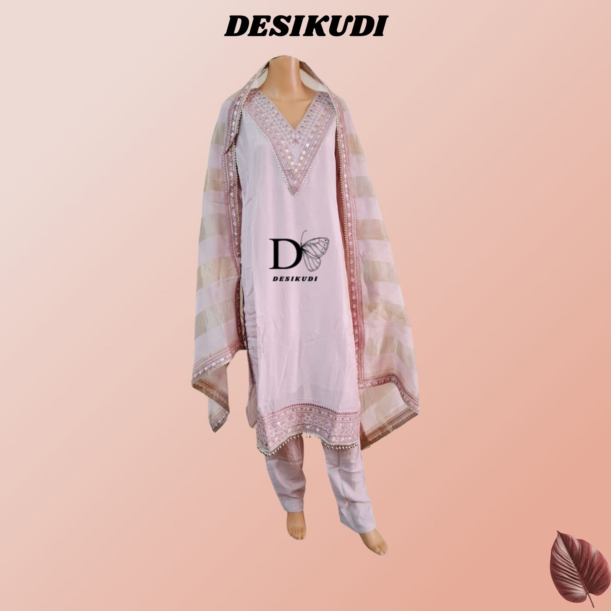 Step into a world of grace with the Blush Elegance Mirror-Work Suit Set. This soft pastel pink ensemble features delicate mirror embellishments and intricate threadwork, giving it a touch of understated glamour. The lightweight fabric ensures comfort, while the organza dupatta with metallic stripes adds an ethereal charm. Whether it's a daytime celebration or a festive gathering, this suit is a perfect blend of tradition and modern sophistication.