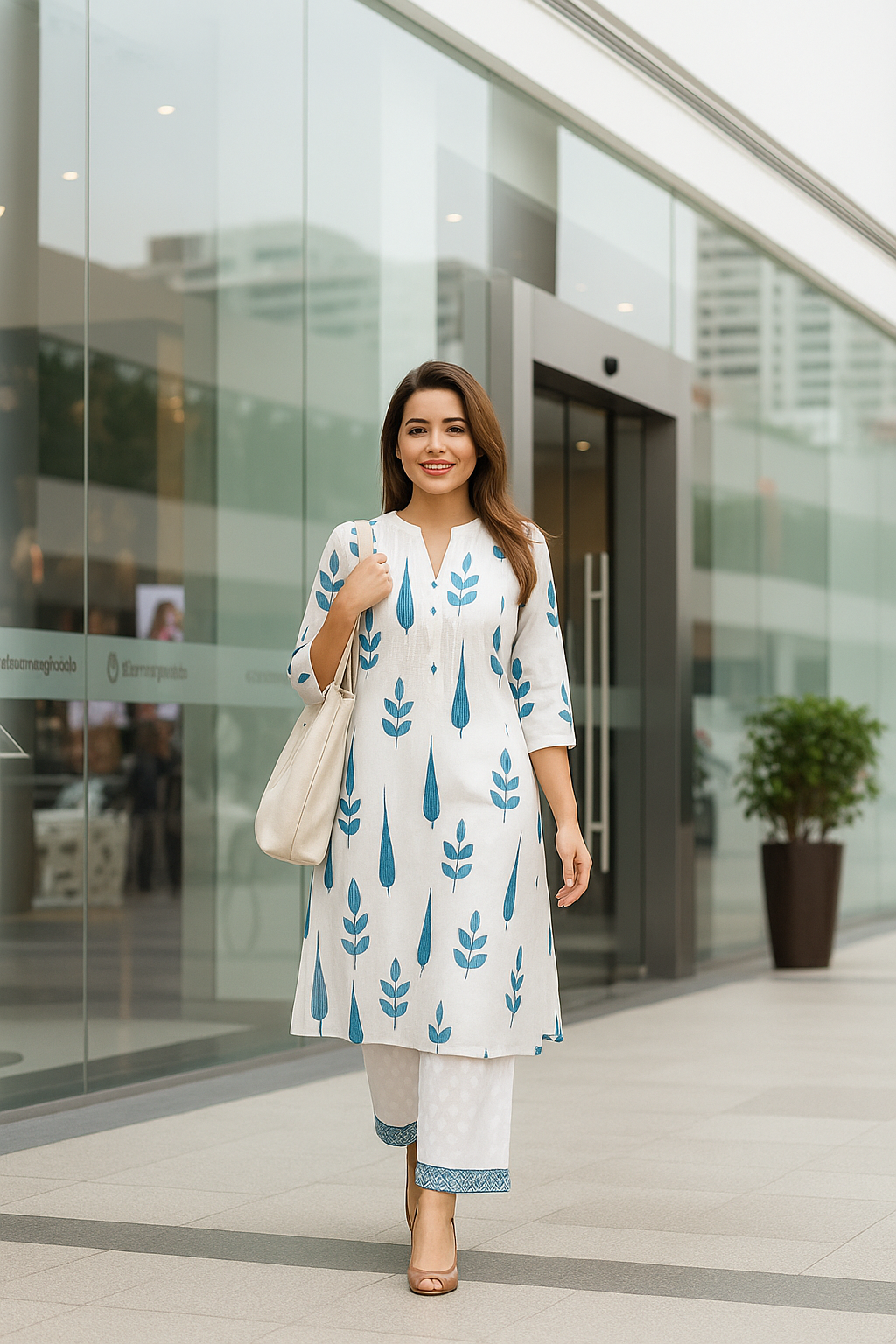 Step into effortless elegance with our White Aura, a breezy and beautiful ensemble crafted in pure white cotton adorned with hand-block style blue floral and leaf motifs. The kurta features fine pintuck detailing on the front and a comfortable A-line silhouette, paired with relaxed fit white trousers dotted with subtle polka prints and intricate ethnic border detailing at the hem. Lightweight and breathable, this set is perfect for sunny workdays or relaxed brunches.