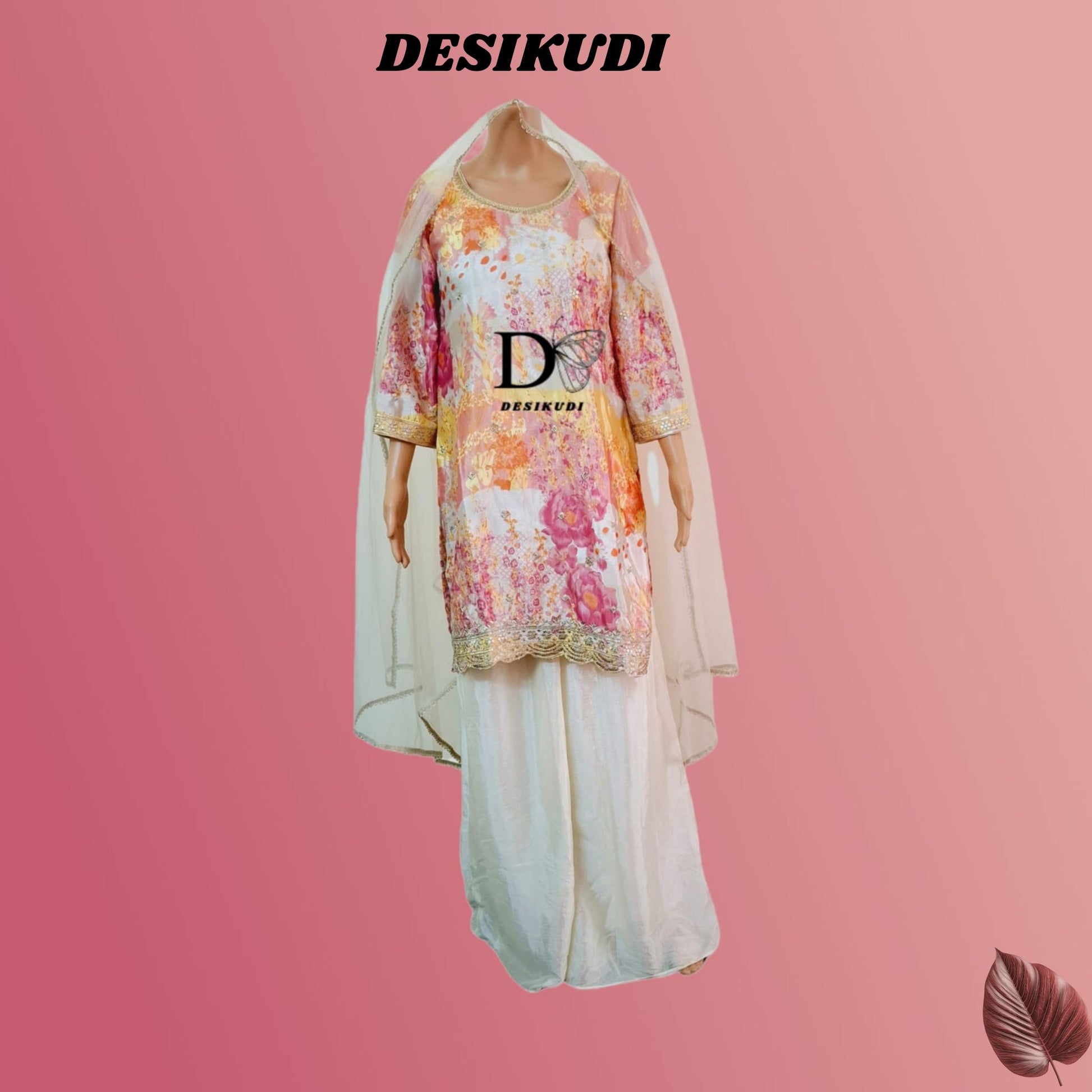 Drenched in warm golden hues and vibrant floral accents, the white Sharara Set is a radiant celebration of traditional charm and modern elegance. The kurti is adorned with intricate mirror work and delicate embroidery, exuding festive opulence. Paired with a flowy crinkled sharara and a sheer dupatta with shimmering borders, this set is perfect for festive gatherings, haldi ceremonies, or special occasions where you want to shine effortlessly.